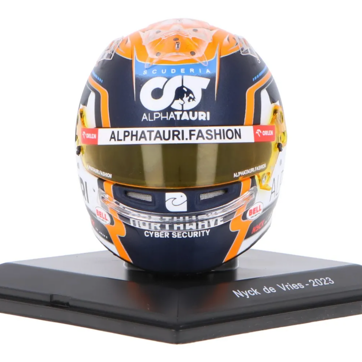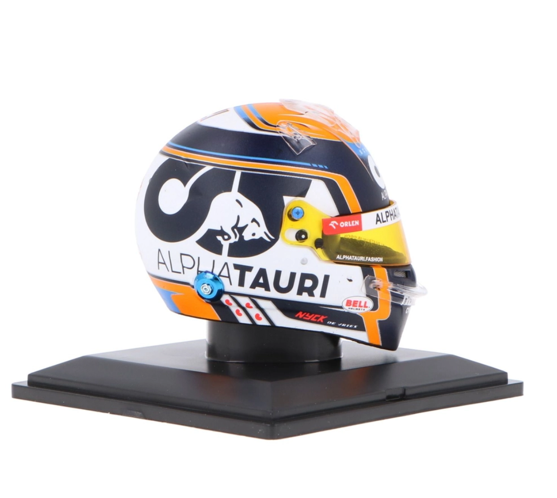 - Authentic Design Details: Faithful reproduction of the Bell helmet worn by Nyck de Vries during the 2023 F1 season with AlphaTauri-branded livery and accurate colors.